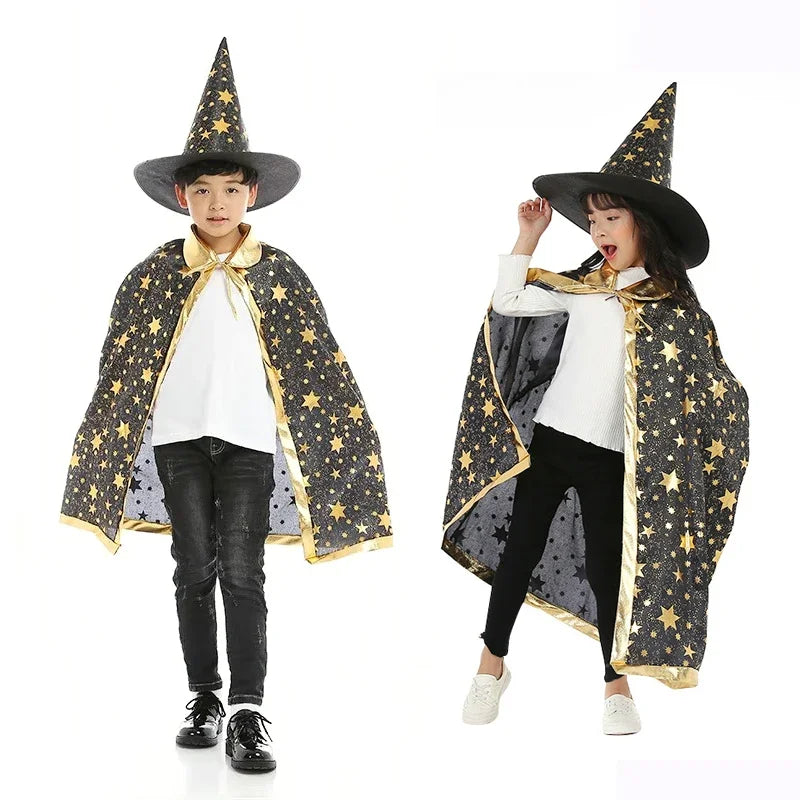 Kids Magician Wizard Cloak & Hat Set – Starry Cosplay Costume for Boys & Girls